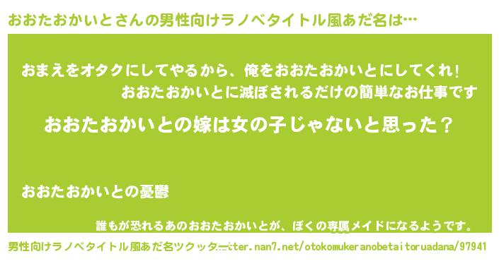 | 女子向けラノベタイトル風あだ名 | 『おおたおかいとの卵を拾いまして』 |