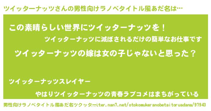 | 女子向けラノベタイトル風あだ名 | 『ツイッターナッツ様がみてる』 |