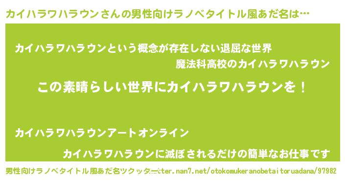 | 女子向けラノベタイトル風あだ名 | 『悪役カイハラワハラウンに転生したようですが、知った事ではありません』 |