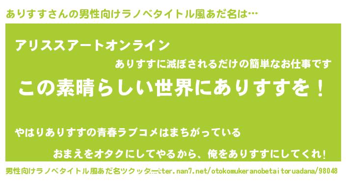 | 女子向けラノベタイトル風あだ名 | 『悪役ありすすに転生したようですが、知った事ではありません』 |