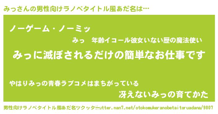 | 女子向けラノベタイトル風あだ名 | 『横柄みっと宰相陛下』『みっ恋絵巻』 |