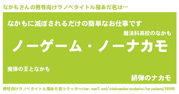| 女子向けラノベタイトル風あだ名 | 『死神なかもの再婚』 |