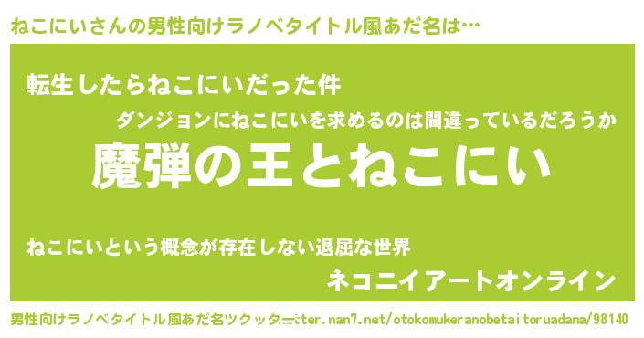 | 女子向けラノベタイトル風あだ名 | 『乙女ゲームの破滅フラグしかない悪役ねこにいに転生してしまった…』 |