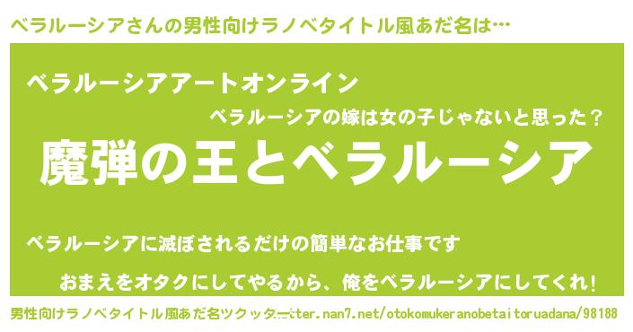 | 女子向けラノベタイトル風あだ名 | 『ベラルーシアが死なない童話 林檎のベラルーシアの診療簿』 |