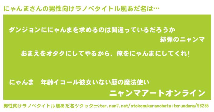 | 女子向けラノベタイトル風あだ名 | 『にゃんま夫妻のなれそめ』 |