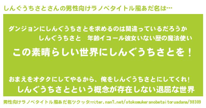 | 胡散臭い通販商品みたいなあだ名 | 『あなたにだけ特別に提供する100年もののヴィンテージワイン…その名も「しんぐうちさと」』 |