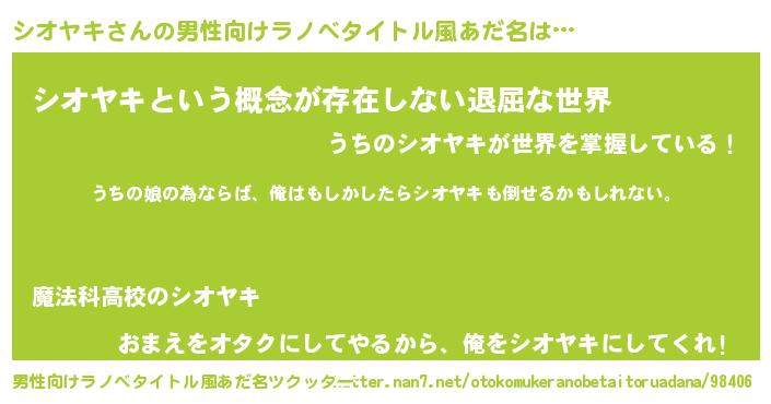 | 女子向けラノベタイトル風あだ名 | 『シオヤキの婚約者』『シオヤキ恋絵巻』 |
