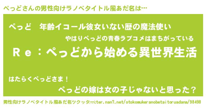 | 女子向けラノベタイトル風あだ名 | 『闇のぺっど』『ぺっどの玉の輿計画!』 |