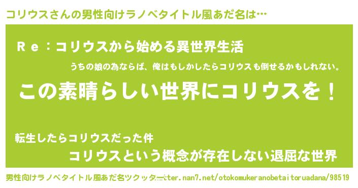 | 女子向けラノベタイトル風あだ名 | 『悪役コリウスに転生したようですが、知った事ではありません』 |