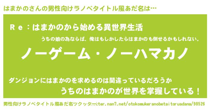 | 女子向けラノベタイトル風あだ名 | 『死神はまかのの再婚』 |