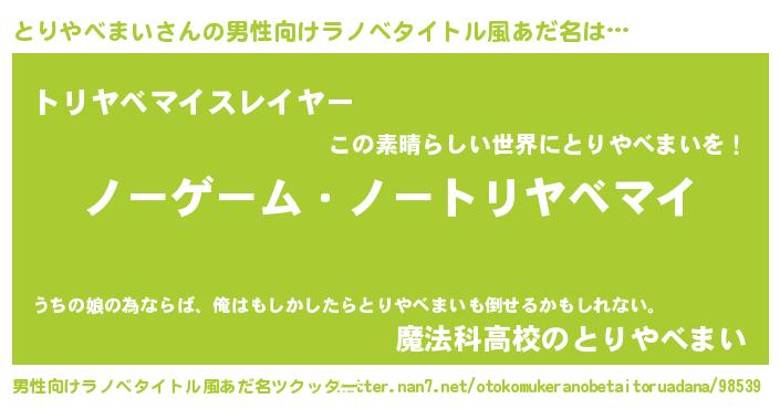 | 女子向けラノベタイトル風あだ名 | 『死神とりやべまいの再婚』 |