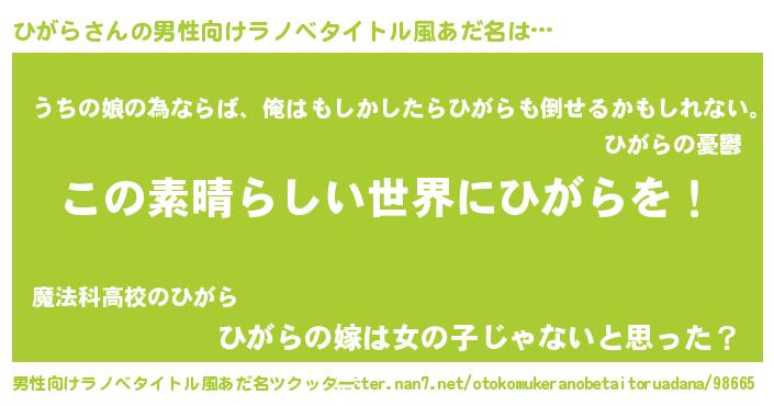 | 女子向けラノベタイトル風あだ名 | 『乙女ゲームの破滅フラグしかない悪役ひがらに転生してしまった…』 |