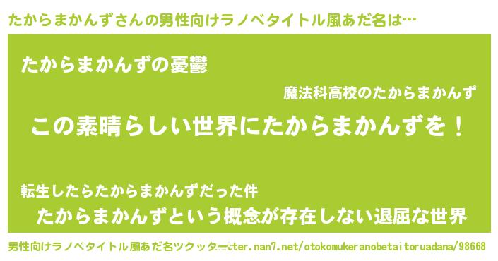 | 胡散臭い通販商品みたいなあだ名 | 『世界中を虜にした世界で10本だけ現存している希少なブランデー…その名も「たからまかんず」』 |
