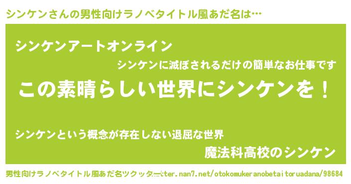 | 意味不明あだ名 | 『住所不定無職シンケン(93歳)』 |