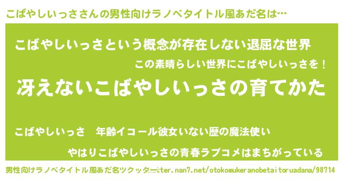 | 胡散臭い通販商品みたいなあだ名 | 『来世でも幸せになれる水素水…その名も「こばやしいっさ」』 |
