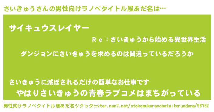 | 女子向けラノベタイトル風あだ名 | 『さいきゅうは平凡を望む』 |