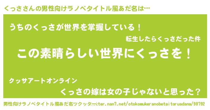 | 胡散臭い通販商品みたいなあだ名 | 『世界中を虜にした100年もののヴィンテージワイン…その名も「くっさ」』 |