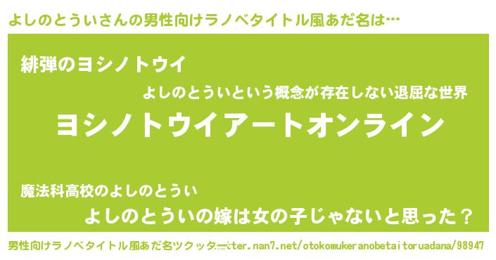 | 胡散臭い通販商品みたいなあだ名 | 『モテモテ間違いなし水晶球…その名も「よしのとうい」』 |