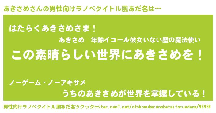| 意味不明あだ名 | 『住所不定無職あきさめ(71歳)』 |