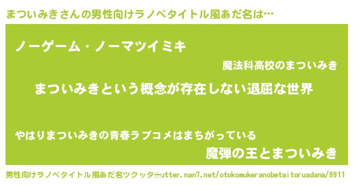 | 女子向けラノベタイトル風あだ名 | 『まついみきの契約王妃』 |