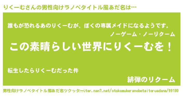 | 女子向けラノベタイトル風あだ名 | 『乙女ゲームの破滅フラグしかない悪役りくーむに転生してしまった…』 |