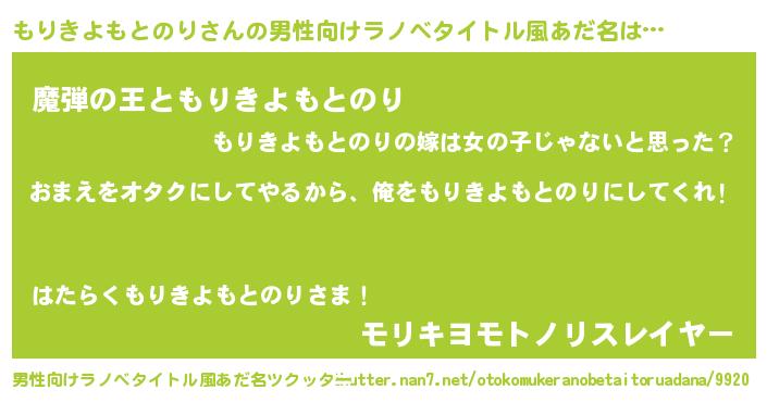 | 女子向けラノベタイトル風あだ名 | 『もりきよもとのり夫妻のなれそめ』 |
