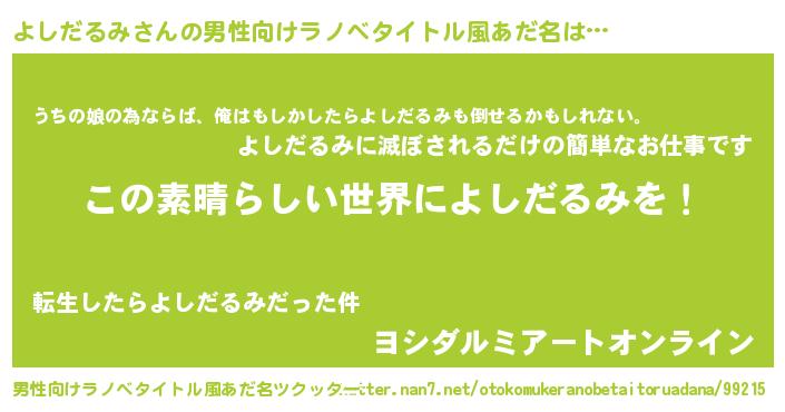 | 女子向けラノベタイトル風あだ名 | 『乙女ゲームの破滅フラグしかない悪役よしだるみに転生してしまった…』 |