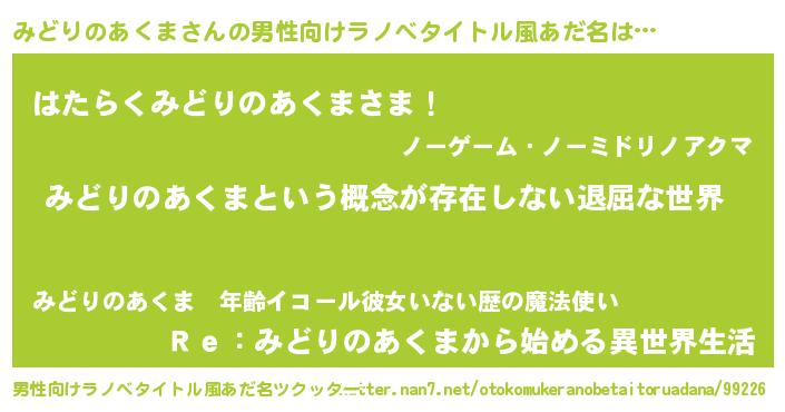 | 女子向けラノベタイトル風あだ名 | 『異世界で失敗しない100のみどりのあくま』 |