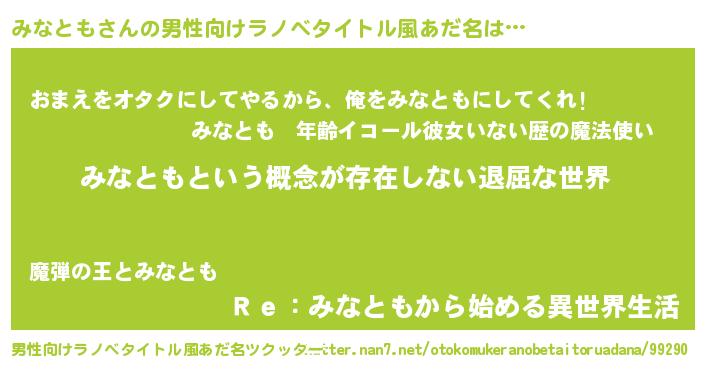| 女子向けラノベタイトル風あだ名 | 『異世界で失敗しない100のみなとも』 |