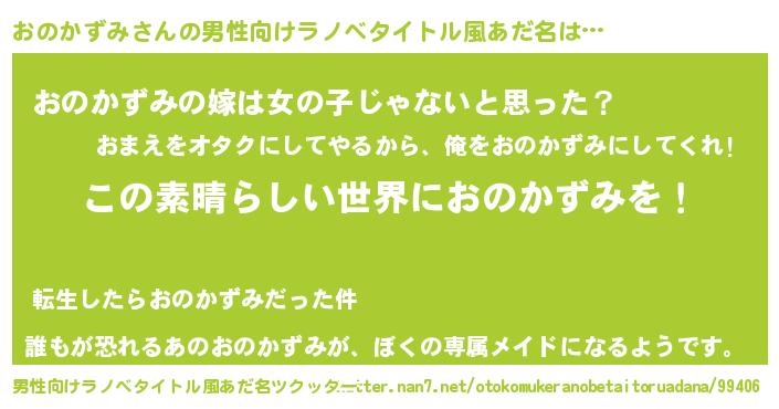 | 女子向けラノベタイトル風あだ名 | 『乙女ゲームの破滅フラグしかない悪役おのかずみに転生してしまった…』 |