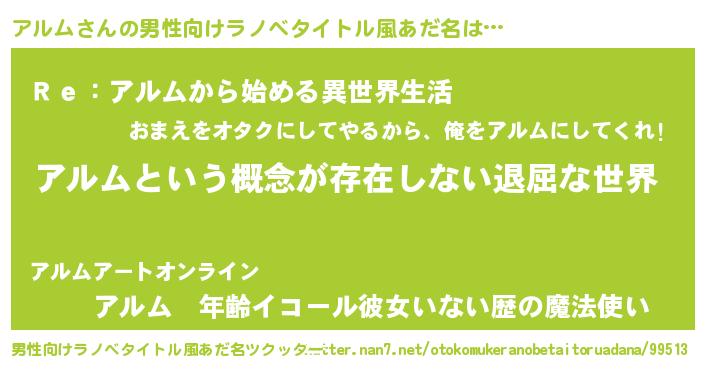 | 女子向けラノベタイトル風あだ名 | 『アルムの契約王妃』『闇のアルム』 |