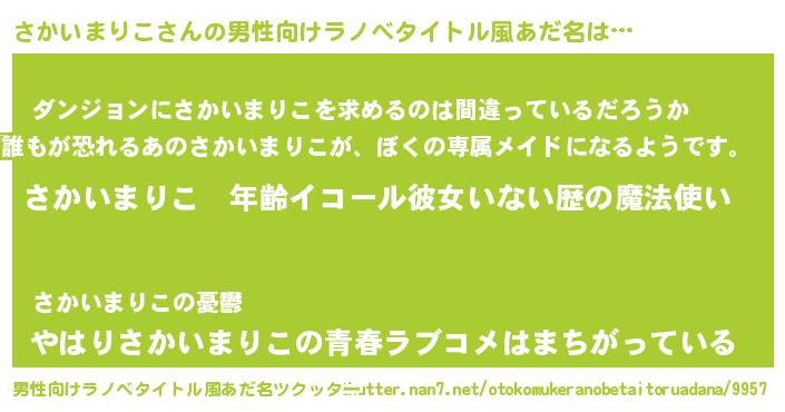 | 女子向けラノベタイトル風あだ名 | 『さかいまりこの玉の輿計画!』 |