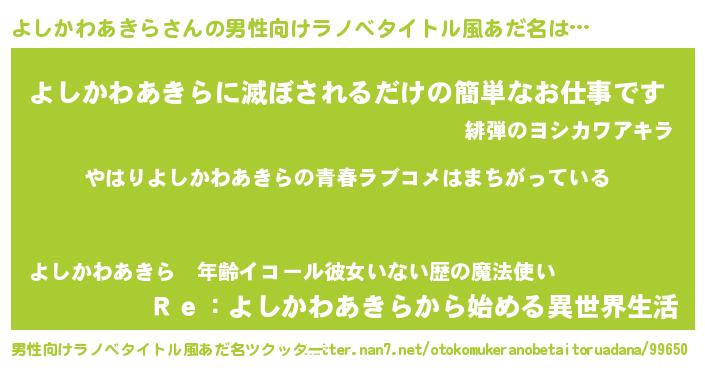 | 女子向けラノベタイトル風あだ名 | 『よしかわあきらの雑貨屋さん』 |