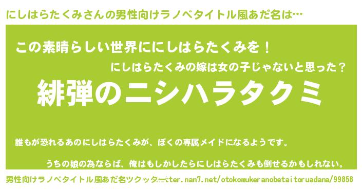 | 意味不明あだ名 | 『住所不定無職にしはらたくみ(40歳)』 |