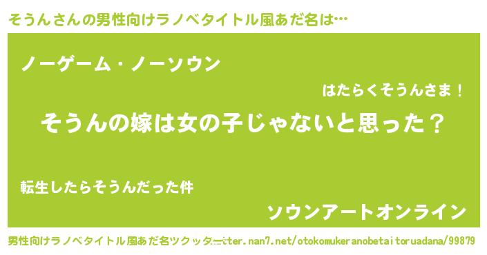 | 女子向けラノベタイトル風あだ名 | 『そうんの卵を拾いまして』 |