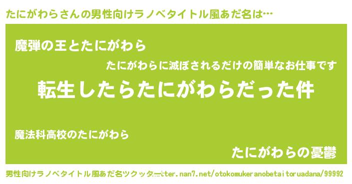 | 女子向けラノベタイトル風あだ名 | 『たにがわらの玉の輿計画!』 |