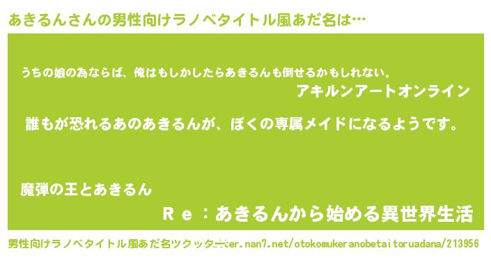 | 女子向けラノベタイトル風あだ名 | 『異世界でカフェあきるんを開店しました。』 |