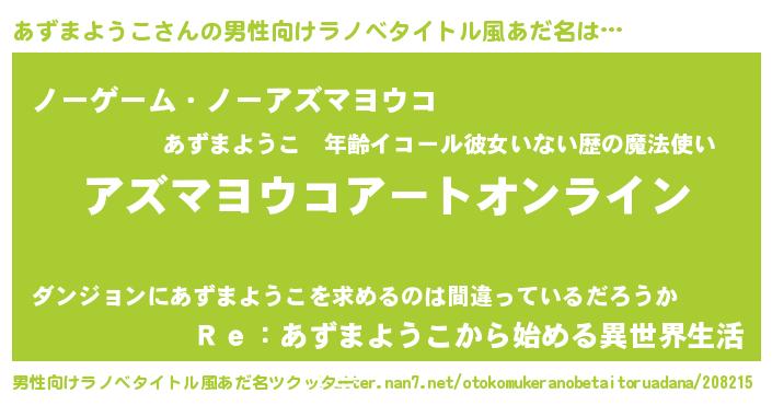 | 女子向けラノベタイトル風あだ名 | 『あずまようこ姫と円卓の騎士』 |