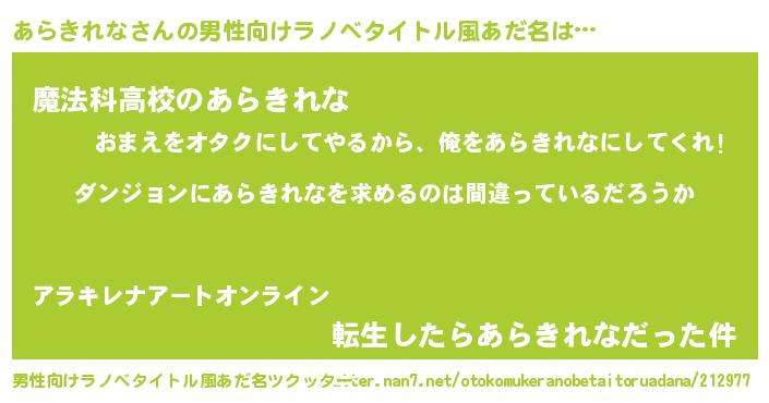 | 胡散臭い通販商品みたいなあだ名 | 『信頼と実績のサプリメント…その名も「あらきれな」』 |