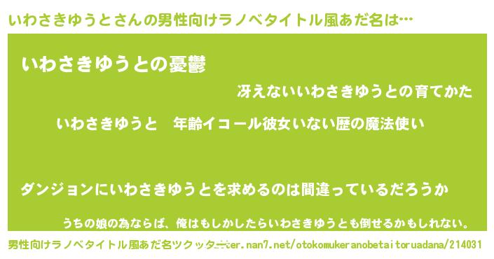 | 女子向けラノベタイトル風あだ名 | 『いわさきゆうとの玉の輿計画!』 |