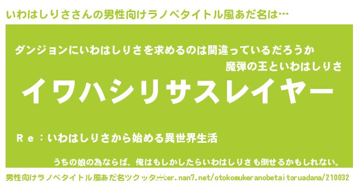 | 胡散臭い通販商品みたいなあだ名 | 『信頼と実績のサプリメント…その名も「いわはしりさ」』 |