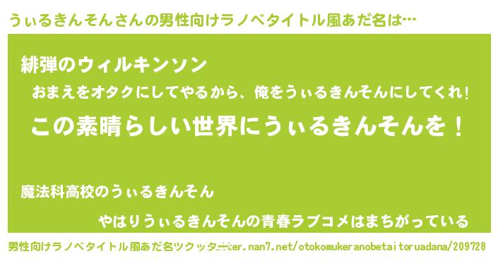 | 意味不明あだ名 | 『住所不定無職うぃるきんそん(1歳)』 |