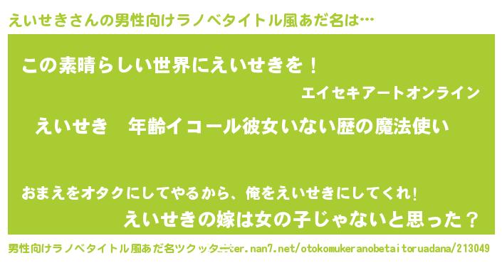 | 女子向けラノベタイトル風あだ名 | 『えいせきの玉の輿計画!』 |