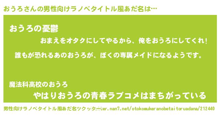 | 胡散臭い通販商品みたいなあだ名 | 『来世でも幸せになれる水素水…その名も「おうろ」』 |