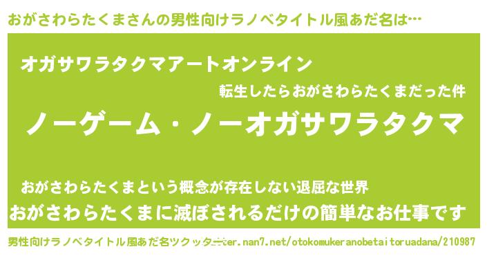 | ヘコむあだ名 | 『おがにゅー』『おがさわらたくま(震え声)』 |