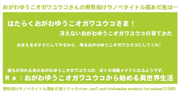 | 女子向けラノベタイトル風あだ名 | 『おがわゆうこオガワユウコ夫妻のなれそめ』 |