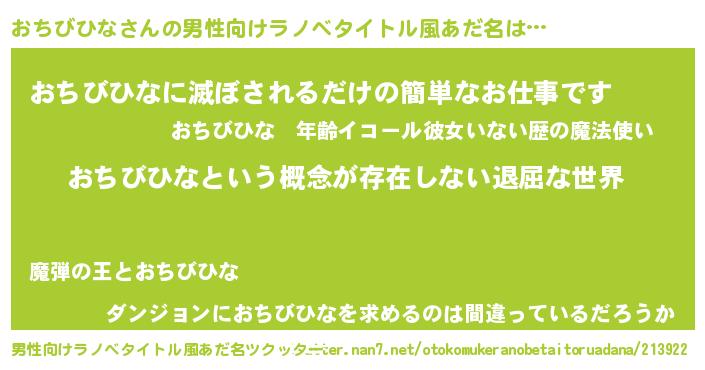 | 女子向けラノベタイトル風あだ名 | 『異世界で失敗しない100のおちびひな』 |