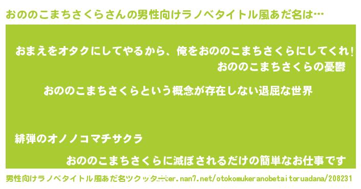| 女子向けラノベタイトル風あだ名 | 『異世界で失敗しない100のおののこまちさくら』 |