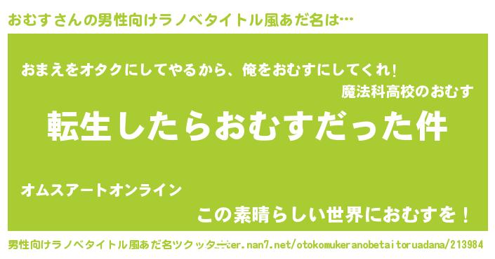 | 女子向けラノベタイトル風あだ名 | 『おむすの玉の輿計画!』『おむす恋絵巻』 |