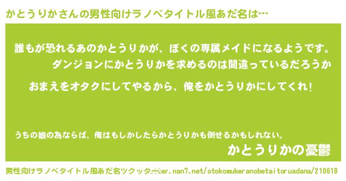 | 女子向けラノベタイトル風あだ名 | 『かとうりか夫妻のなれそめ』 |